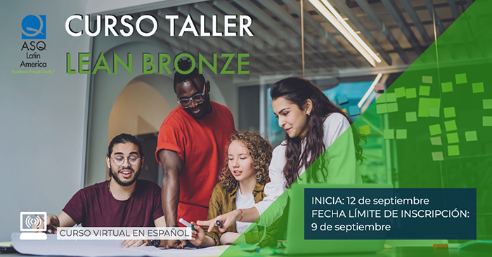 ASQ Latinoamérica los invita al curso taller de Lean Bronze, el cual iniciará el 12 de septiembre. La fecha límite de inscripción es el 9 de septiembre de 2022. Este curso se impartirá en formato virtual, en idioma español.